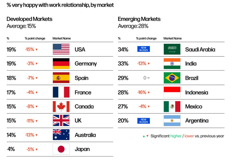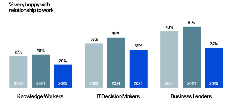 This year’s results reveal that fulfillment at work has hit a historic low. Only 20% of knowledge workers report a healthy relationship with work, down 8 points from 2024. The most dramatic decline is among business leaders, underscoring a crisis of connection and confidence at the very top. Yet the study also finds that 85% of the factors influencing workplace fulfillment are within an organization’s control, underscoring a significant opportunity for businesses to lead change and rebuild stronger work relationships.