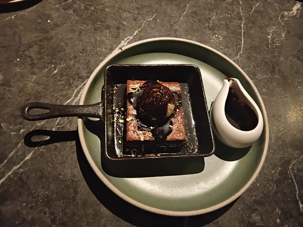 The culinary experience concluded on a delightful note with a warm chocolate brownie stuffed with walnuts and topped with kulfi—a perfect fusion dessert.