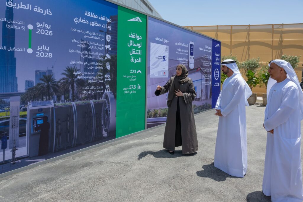 As part of efforts to support sustainable mobility, Sheikh Hamdan reviewed the soft mobility parking facilities project, which aims to streamline the use of bicycles and electric scooters. The facilities feature modern designs that provide shade and protection from sunlight, scooter-charging capability, and smart systems for monitoring usage, while also creating advertising investment opportunities.