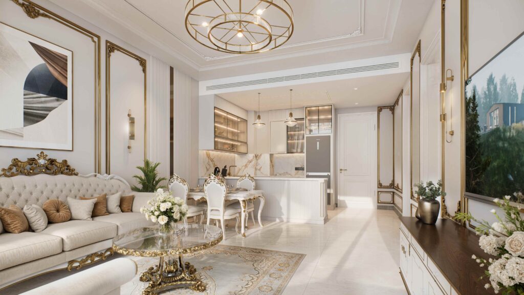 Expansive balconies bring the outdoor environment into the home, allowing residents to experience fresh air, greenery, and natural daylight a rare feature in classical-style buildings. The fine selection of materials, from polished surfaces to textured finishes, creates an atmosphere that feels both regal and welcoming.
